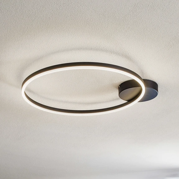 Пръстеновидна LED лампа за таван Giotto в черно Тази елегантна лампа за таван от италианския производител Fabas Luce, наречена Giotto, е оборудвана с димируеми светодиоди, за да създаде подходящо настроение във всяка ситуация. Компактната ѝ конструкция и сдържаната цветова гама създават неподвластен на времето дизайн. Лампата за таван се състои от здрава метална рамка в черен цвят, в която са разположени светодиодите. Тя е прикрепена към тавана с помощта на просто окачване, което хармонично завършва дизайна на лампата. Цялото осветително тяло впечатлява със своята проста и елегантна форма, както и с практичната си функция за затъмняване.