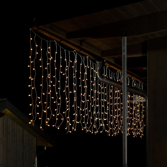 400-лъчева микросветлинна завеса предлага празнична украса на открито Отделните нишки на тази светлинна завеса са с дължина 1 метър, а кабелът е прозрачен. 400 равномерно разпределени светодиода осветяват тъмната зимна нощ с топла бяла светлина и създават светлинен блясък, който кара всички да очакват с нетърпение Коледа - Включен трансформатор за външна употреба