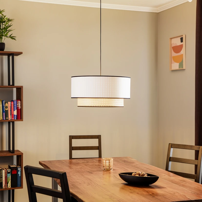 Кръгла висяща лампа Boho с абажур от ратан и памук в нежна бяла цветова гама Boho е идеална за осветяване на всекидневна или трапезария. Висящата лампа впечатлява с впечатляващия си дизайн, който произхожда от Скандинавия и също така излъчва известен чар на селска къща. Абажурът му е съставен от два елемента и има перфорирана шарка от долната страна, която е характерна за ратана. Ако лампата Boho е снабдена с подходящи източници на светлина, тя създава вълнуваща игра на светлината и създава уютна атмосфера.