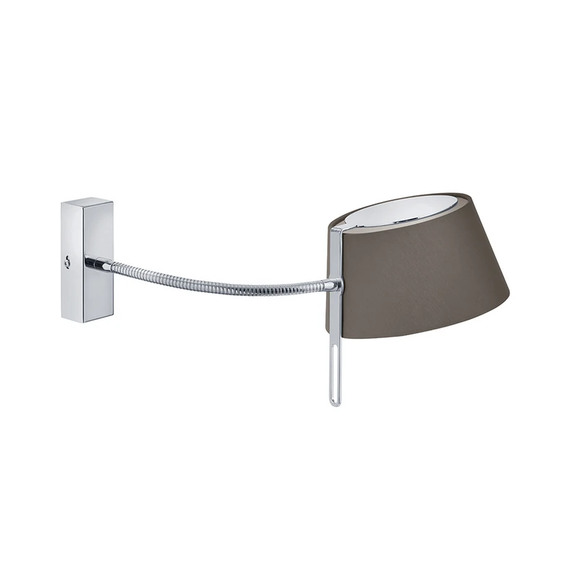 Гъвкавост и елегантност: стенна лампа с абажур от ситц Висококачествен абажур от плат ситц увенчава тази елегантна стенна лампа. Елегантният абажур е прикрепен към здраво гъвкаво рамо, така че главата на лампата може да се регулира индивидуално, за да осветява желаната зона. Както рамото, така и стенната скоба са изработени от алуминий, желязо и месинг и са допълнени от матово никелово покритие. Резултатът е функционална, но изящна стенна лампа, която може да се използва в спалнята над леглото като лампа за четене, в коридора и всекидневната за общо осветление или като акцентна светлина.