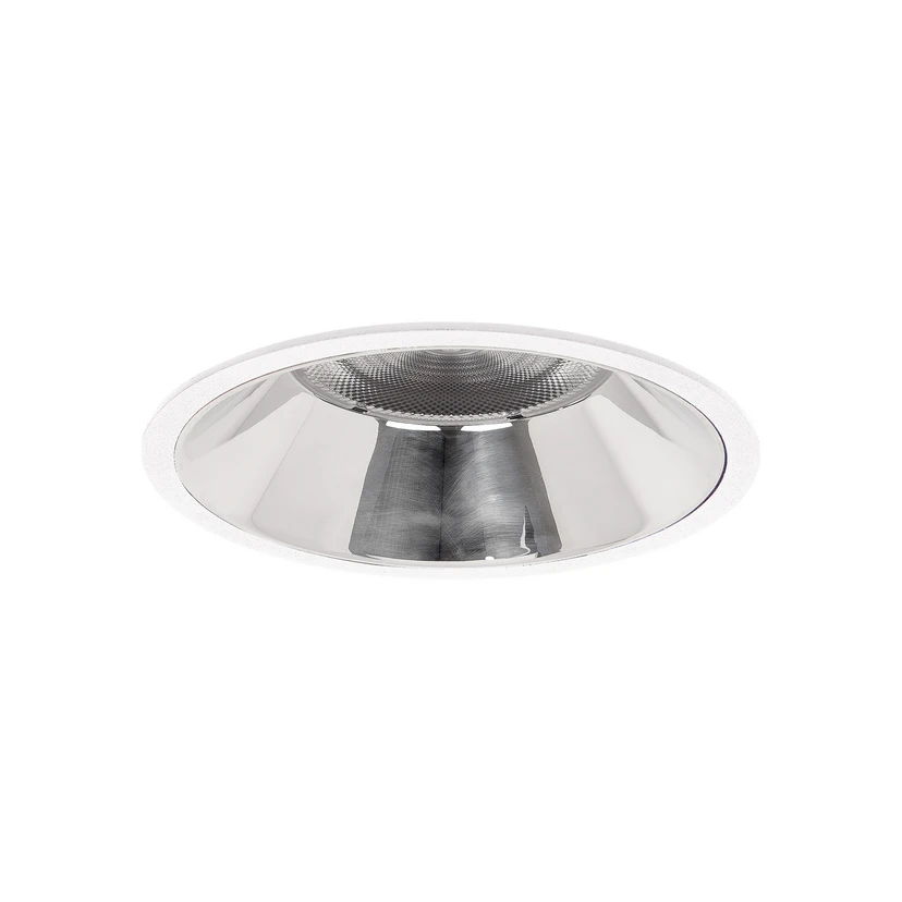 LED прожектор за вграждане Apollo Maxi с гладък рефлектор, кръгъл Кръглият LED прожектор за вграждане Apollo Maxi е изработен от алуминий и има гладък рефлектор и прозрачен пластмасов капак. Тя може да се монтира на тавана без инструменти благодарение на монтажните пружини. Сребристият, гладък рефлектор с ротационно симетрично разпределение на светлината с тесен и широк лъч осигурява висока светлинна ефективност, а прозрачният капак - оптимално разпределение на светлината - особено добро цветопредаване - индекс на цветопредаване CRI > 90 - експлоатационен живот L80/B10 при 25 °C: 50.000 h, експлоатационен живот L80/B50 при 25 °C: 50 000 h - материал на корпуса: алуминий / стъкло / пластмаса - допустима температура на околната среда (ta): -20 °C - +25 °C - с електронно управляващо устройство, превключващо се. не може да се димира