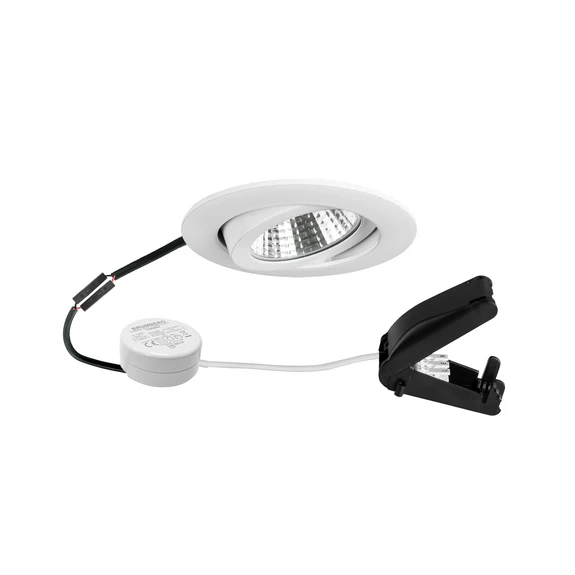 LED прожектор за вграждане BB03 с кутия за свързване, димируем край (RC), въртящ се, кръгъл драйвер Кръглият LED прожектор за вграждане BB03, изработен от алуминий, е идеалното осветление за частни и обществени интериори с модерен стил на обзавеждане - от хотелски функционални зали до коридори и дневни. Светодиодите са разположени в глава, оборудвана със сребърен рефлектор с въртящо се симетрично, тясно-широкообхватно разпределение на светлината, който може да се движи наоколо, така че светлинният лъч да бъде насочен към желаната зона. Включени са светодиоден драйвер с възможност за димиране чрез фазов димер, кутия за свързване и монтажни пружини за закрепване без инструменти - Включва кръгъл светодиоден преобразувател; външно димиране чрез фазов димер (RC) - Ъгъл на излъчване: 38° - Обхват на завъртане: 30° в кръг - Дебелина на тавана: макс. 1,3 cm