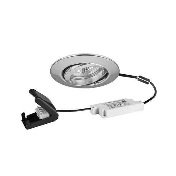 Комплект BB13 кръгъл светодиоден прожектор за вграждане с драйвер с възможност за димиране (RC) и свързваща кутия Комплектът BB13 светодиоден прожектор за вграждане се състои от кръгъл светодиоден прожектор за вграждане, светодиоден драйвер, който може да се димира с помощта на димер за вграждане (RC), и свързваща кутия. Кръглият прожектор за вграждане излъчва топла бяла светлина под ъгъл 38°. Светлинният конус може да бъде насочен в желаната посока чрез завъртане на прожектора на 25°. Ако осветителят се затъмни чрез външен фазов димер на крайния панел, цветът на светлината се променя благодарение на функцията dim-2-warm. Докато при пълна яркост се излъчва топло бяло осветление с цветна температура 3 000 К, в процеса на димиране цветната температура се намалява до 1 800 К при най-ниското ниво на димиране. - вкл. електронно управляващо устройство, фазово управление на крайния дим (RC) - функция dim2warm - вкл. свързваща кутия - сребърен рефлектор с ротационно симетрично разпределение на светлината с дълбок широк лъч - прозрачен стъклен капак - без капак с топлоизолационен материал - макс. дебелина на тавана 15 mm