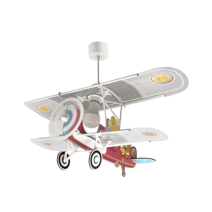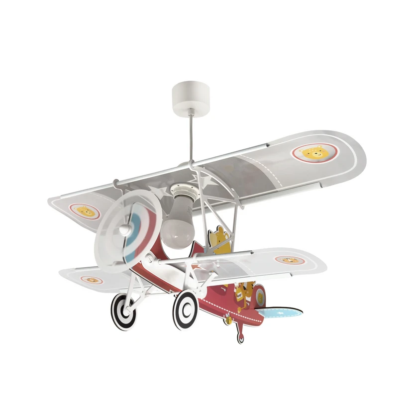 Цветна детска висяща лампа Мечо самолет за малки пилоти Много деца се стремят към мечтаната професия - например пилот. Тази висяща лампа със закачлив дизайн на самолет може да привлече интересите на много малки деца. Тя е визуална атракция, която разкрива техните предпочитания и насърчава детския ентусиазъм с грижовно разработени детайли. Цветният модел е много привлекателен за окото и включва мотив на самолет с две плюшени мечета като пилот и пътник. Конструкцията е изработена от MDF дърво, с ABS пластмаса и крила от огнеупорен полипропилен. Като специална характеристика е използван флуоресцентен материал, така че висящото осветително тяло Teddy Plane продължава да свети дискретно в продължение на 10 до 15 минути след изключване на светлината. Произведена е в Испания.