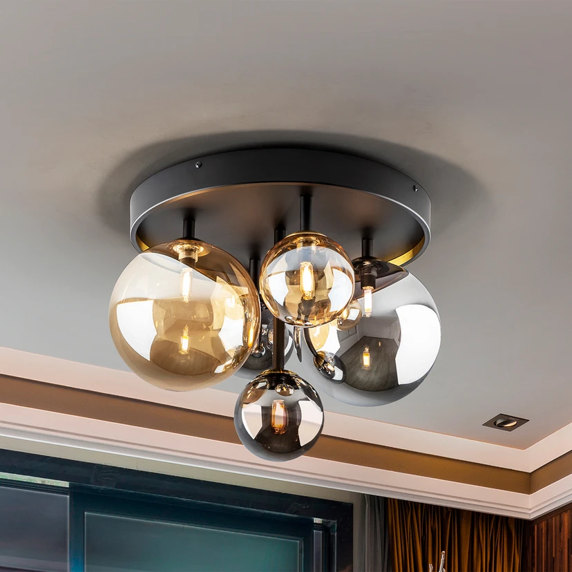 Тъмно осветление за таван: елегантност и гъвкавост в кехлибарено и опушено сиво Петсветлинното тъмно осветление за таван съчетава стилен дизайн с приятно осветление. Изработена от висококачествено стъкло и метал, тя предлага очарователна комбинация от кехлибарени и опушено сиви стъклени абажури със сферична форма и два различни размера, които се простират надолу от кръглия балдахин на малки скоби с различна дължина. Осветителното тяло се доставя с енергийно ефективни светодиодни източници G9, които създават приятна атмосфера с топлия си бял цвят на светлината. Благодарение на стандартизирания цокъл G9 светодиодният източник на светлина може лесно да се подмени, което прави лампата за таван Dark дълготраен и енергоспестяващ избор.