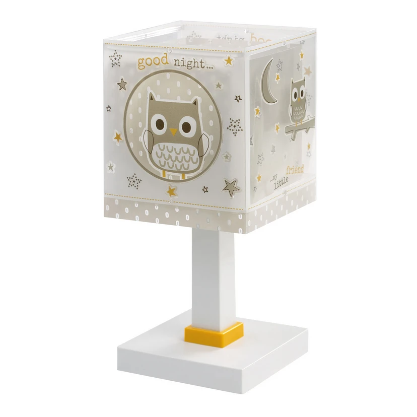 Ъглова настолна лампа "Лека нощ" със сладки сови "Лека нощ" - това пожелава тази настолна лампа, чийто дизайн и меко разпределена светлина допринасят значително за създаването на уютна и атмосфера в детската стая. Изработена от два абажура, тя осигурява визуална привлекателност с триизмерния си вид и сладките изображения. Цветовете, съчетани в меки нюанси на кафявото, откриват сови, звезди, дървета и луна. Горният, прозрачен нюанс е украсен с много детайли и включва повечето от привлекателните мотиви. Долният, полупрозрачен абажур произвежда светлина без отблясъци, която се излъчва навсякъде. Удобен за управление с помощта на превключвателя на захранващия кабел - Максимална дължина на използваната крушка: 10,5 см