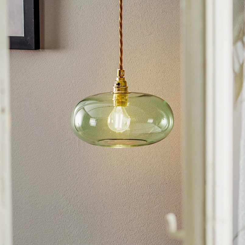 Висяща лампа Horizon с ръчно издухано стъкло в елегантно зелено Овален и плосък - такъв е дизайнът на естетичния абажур, който е уникален за всяка лампа като ръчно издухано изделие. Със своя дизайн и естественост той отразява по специален начин аспектите на природата и напомня за очарователната шир на хоризонта. Полупрозрачното стъкло в красив фин зелен цвят запазва видимостта на вътрешните елементи и осигурява магически светлинен ефект, който се разпределя равномерно в цялото помещение. Младата марка EBB & FLOW означава декоративно осветление и е основана през 2009 г. от Сузане Нилсен. Тя е отговорна за всички проекти, които винаги се отличават с датско-скандинавски или британски стил. Ръчно издуханите лампи се произвеждат в Европа с помощта на традиционно майсторство и освен с атрактивния си дизайн винаги впечатляват и с високото си качество на изработка. Абажурът е изработен от ръчно издухано стъкло. Всяка лампа е уникална; поради производствения процес е възможно да има леки отклонения, като например малки въздушни джобове и др.
