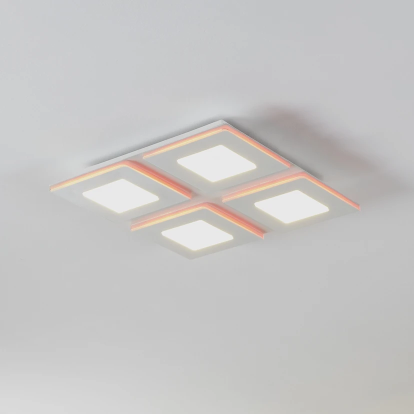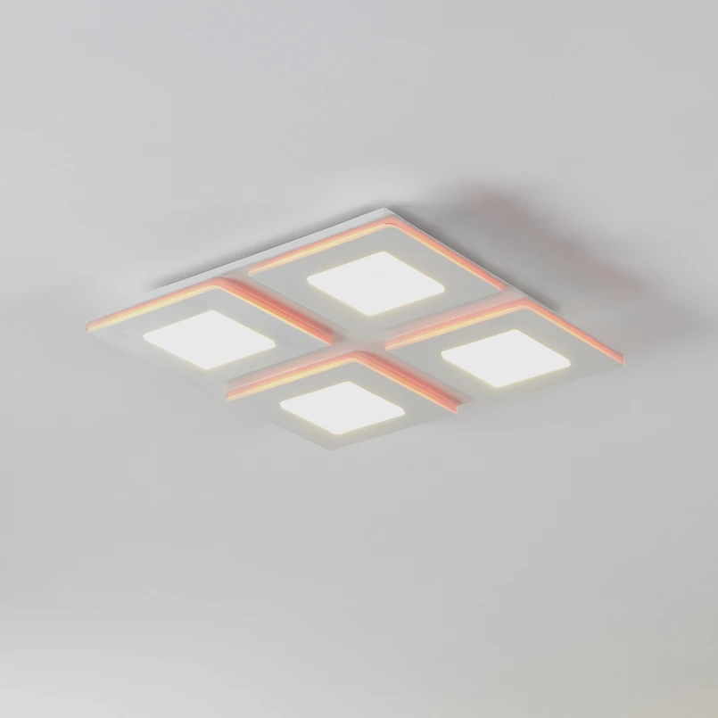 Светодиодна лампа за таван Padrogiano-Z Eglo Connect, 4-светлинна, квадратна Светодиодната лампа за таван Padrogiano-Z от серията за интелигентен дом connect.Z е изработена от бял метал с четири пластмасови квадрата отгоре. Вградените светодиоди излъчват приятна светлина по желание, защото благодарение на RGB и CCT промяната на цвета може да се избира както бяла светлина в диапазона от топло бяло до бяло дневно осветление, така и цветно осветление от различни ярки цветове. Външният и вътрешният акрилен пръстен могат да се включват и изключват, както и да се затъмняват поотделно. Лампата за таван се управлява чрез безплатно приложение (AwoX Home Control) и осигурява достъп до допълнителни удобни функции, като димиране, таймер, симулиране на присъствие и много други. Светодиодният панел се управлява чрез Bluetooth и ZigBee 3.0 и може да се управлява и чрез съвместими гласови асистенти. Алтернативно, интелигентното таванно осветление може да се управлява и с помощта на отделно предлагано дистанционно управление. Квадратната лампа се съчетава с различни интериорни стилове и осигурява атмосферно осветление за всяко помещение - независимо дали е в кухнята, дневната, спалнята, коридора или офиса.