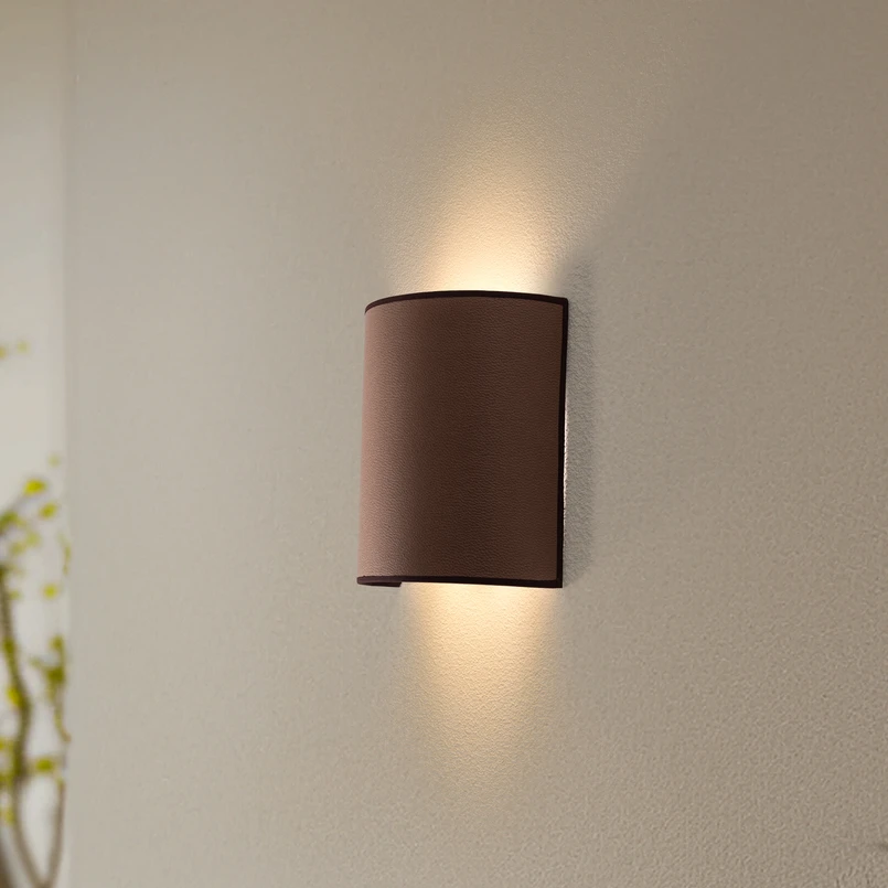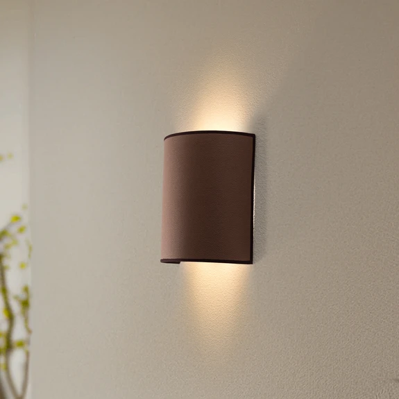 Полукръгла стенна лампа Idun - веган абажур от ябълкова кора Произведената в Европа стенна лампа Idun е снабдена с кафяв абажур във формата на полуцилиндър. Той е изработен от веган имитация на кожа, направена от ябълкови кори, и има приятно, естествено усещане. Светлината се излъчва нагоре и надолу.