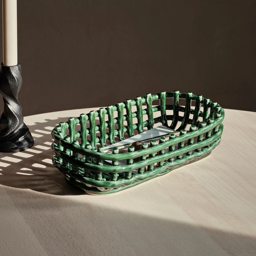 ferm LIVING Керамична кошница, овална, зелена, дължина 30 см, керамика