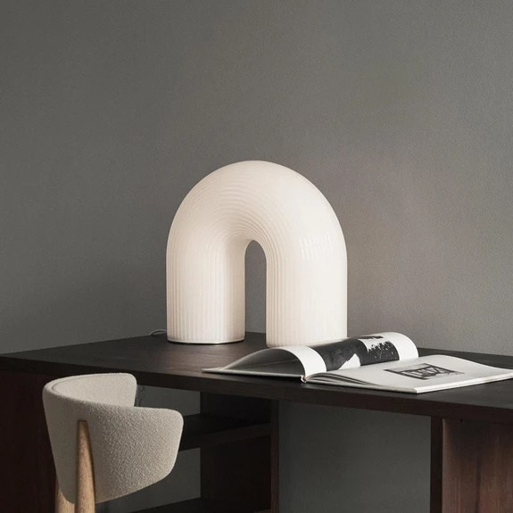 Декоративно осветление от ръчно духано стъкло: подова лампа Vuelta LED с вграден димер, 2 500 K Декоративната подова лампа Vuelta LED е забележително осветително тяло от опалово стъкло със скулптурна арка, напомняща антични колони, и текстурирана оребрена повърхност. Тази изкусно проектирана подова лампа с огромни размери служи едновременно като скулптура и осветление в дома ви. Vuelta е проектирана като LED източник на светлина, който осигурява мека, разсеяна, топла бяла светлина и има регулируема функция за димер, която ви позволява бързо и лесно да контролирате интензивността на светлината. Забележка: Всяка ръчно изработена, ръчно духана стъклена лампа е уникална. Възможни са малки дефекти в стъклото и отклонения от изображението на продукта.
