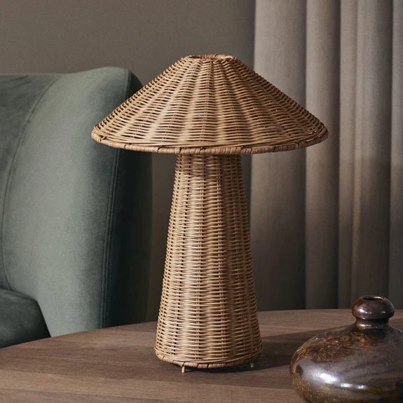 Настолна лампа Dou, изработена от желязо и ратан Настолната лампа Dou на ferm Living е ръчно изплетена от естествен ратан и е символ на очарователния контраст между геометричните форми и органичните структурни характеристики на материала. Тази настолна лампа се характеризира с големи размери и мека, приятна светлина (крушката не е включена, вижте аксесоарите). Абажурът позволява на светлината да прониква през плетения ратан, като придава структура и тактилност на дневната ви зона. Рамката на настолната лампа Dou е изработена от желязо. Превключвателят (включване/изключване) е вграден в кабела на щепсела.