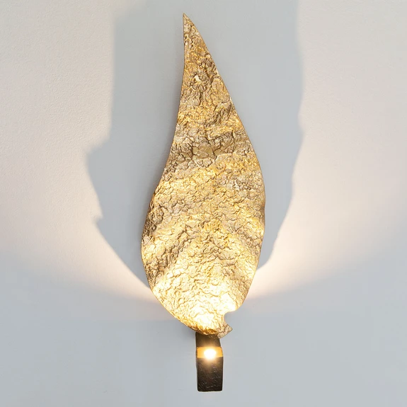 Златна стенна лампа Gamba, изработена от желязо Стенната лампа Gamba впечатлява с комбинацията си от елегантен и същевременно модерен дизайн. Фокусът тук е върху листо със златисто-железен вид и получената игра на светлина и сянка. LED източникът на светлина е монтиран в малка черна основа. Оттук се осветява основната част на лампата във формата на листо. Самото листо е с текстурирана повърхност. Това създава приятно, непряко осветление с поразителни сенки, хвърляни от листата. Тъй като осветителното тяло може да се регулира, интензитетът на светлината може да се регулира в зависимост от ситуацията.