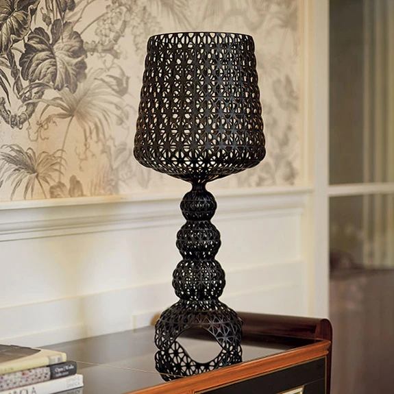 Дизайнерска настолна LED лампа Mini Kabuki със затъмняване Силуетът на настолната LED лампа Mini Kabuki напомня бароков дизайн. Класическите форми и закачливият дизайн се сливат в този дизайнерски модел на Ferruccio Laviani, за да създадат модерен светлинен елемент, оборудван с LED технология. Яркостта може да се регулира индивидуално благодарение на вградения димер. Цветът на светлината е приятно топло бял, който е особено подходящ за атмосферно осветление във всекидневната. За настоящата версия е използван новият "Поликарбонат 2.0" - материал, при който във фазата на синтез се използва възобновяема суровина от целулозно-хартиената промишленост. Процесът, използван за производството на този материал, е сертифициран от ISCC. Малки вдлъбнатини в материала са разпределени по цялото тяло на лампата и абажура, като създават красива светлинна картина в помещението, когато лампата е включена. Архитектът и дизайнер Феручо Лавиани е разработил серията лампи Kabuki за дизайнерската компания Kartell, която включва и най-малката лампа - настолната лампа Mini Kabuki. Пластмасата във всичките ѝ форми и цветове е основният материал, използван за изработката на дизайнерските изделия, с които Kartell стана известна през последните няколко десетилетия. Някои от творенията на Kartell днес са истинска класика в дизайна.