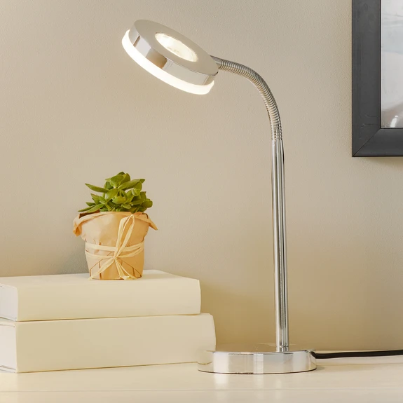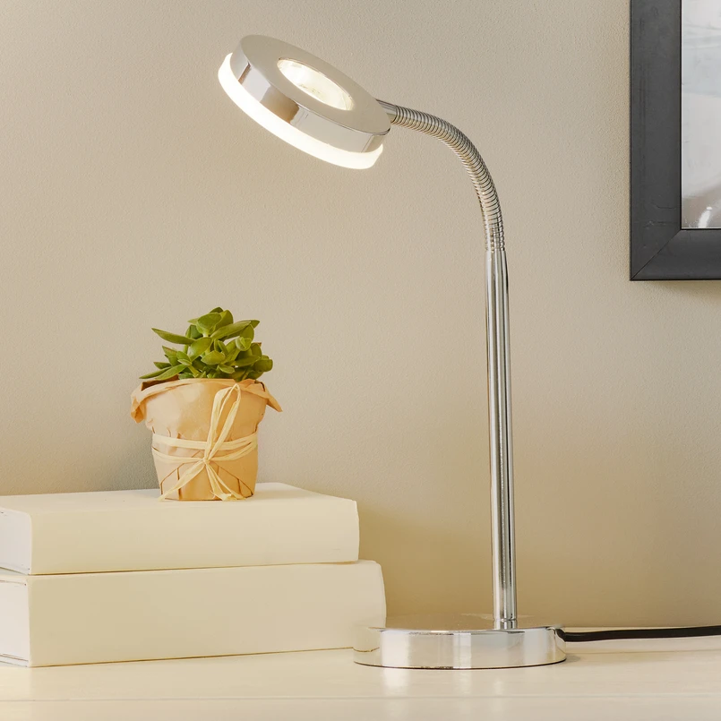 Rennes - настолна LED лампа с модерно докосване LED лампата Rennes се вписва добре в почти всяко бюро. Изработена от лъскава хромирана рамка, лампата Rennes може да придаде модерен вид на всяко бюро. Кръглата форма на абажура се повтаря в основата и когато се комбинират, двете образуват хармонично цяло. Топлата бяла светлина на вградения 4 W светодиод може да се насочва според нуждите, тъй като горната част на рамката може да се регулира гъвкаво.