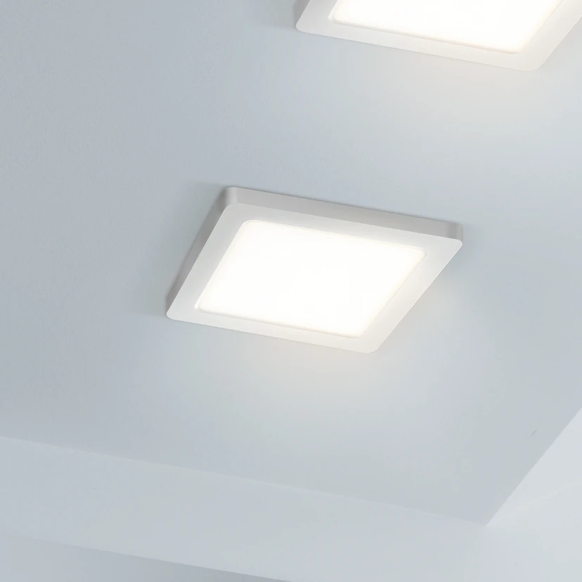 Димируем LED панел Selesto с променлив диаметър на монтаж LED панелът Selesto има квадратна форма и впечатлява с висококачествения си корпус, изработен от бял алуминий. Светлоизлъчващата повърхност, която съставлява най-голямата част от осветителното тяло, излъчва светлината от вградените светодиоди равномерно върху голяма площ. Цветът на светлината може да се регулира според нуждите между топло бяло (800 лумена), универсално бяло (840 лумена) и дневна светлина (860 лумена) с помощта на вградения превключвател на гърба преди монтажа. Интензитетът на светлината на Selesto може да се променя и с помощта на фазови димери на предния и задния край. Светлината, излъчвана от Selesto, се излъчва от матов разсейвател и се насочва директно надолу. Светодиодният панел осигурява добре осветено помещение, особено когато се използват няколко устройства. Меката и равномерна светлина прави панела идеален за използване по-специално в коридори. Selesto е идеален и за използване в офиси - Диаметърът на инсталацията се регулира индивидуално от 5,5 до 12,5 cm