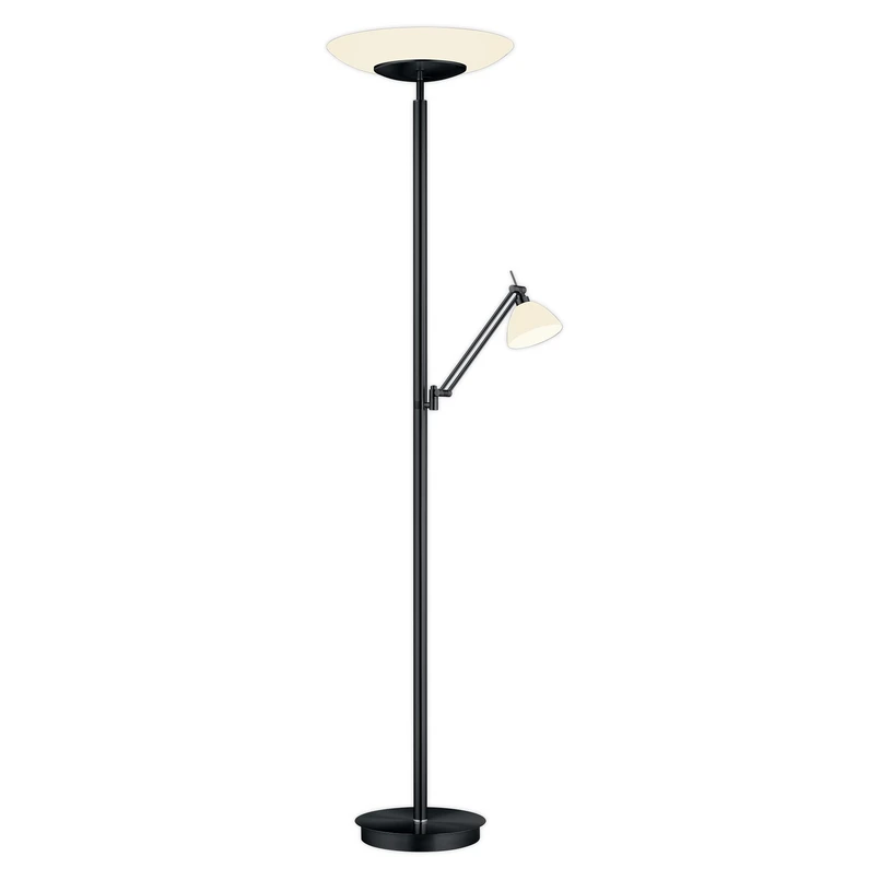 LED подова лампа Findus с прожектор, светлина за четене и вграден димер Findus е подова лампа, която впечатлява с класическия си дизайн без излишни елементи и се съчетава с почти всеки стил на живот. Правата метална рамка с кръгла основа завършва с кръгъл прожекторен елемент, който излъчва приятна светлина. Със своята топла и индиректна светлина LED лампата за таван създава атмосфера, характеризираща се с уют и комфорт. Допълнителното рамо за четене на средната височина на рамката може да се премества гъвкаво и по този начин осигурява насочена светлина, която може да се използва за четене, за да се предпазят очите по време на четене. И двата източника на светлина са оборудвани със светодиоди и могат да се използват заедно или независимо един от друг. Вграденият димер позволява яркостта да се регулира плавно и лесно според ситуацията.