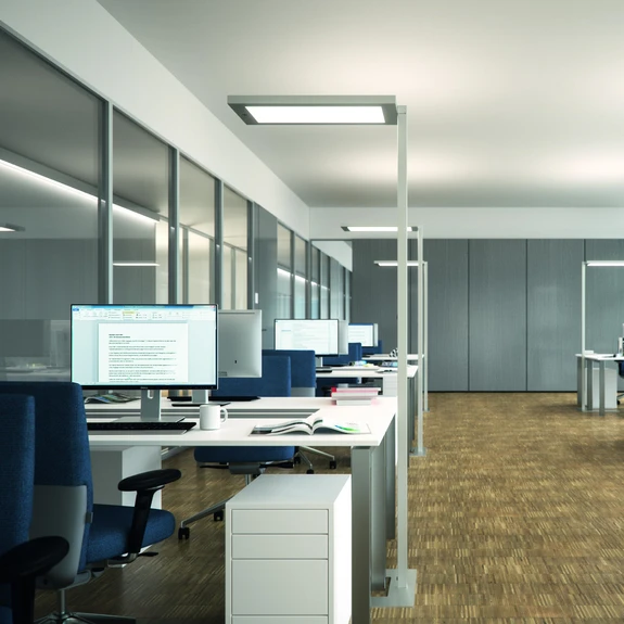 Усъвършенствано осветление за офиса - Lavigo Core DPS 12500/840/R/G1 LED свободностоящо осветително тяло Свободностоящото осветително тяло Lavigo Core DPS 12500/840/R/G1 за офиса е с технически неутрален дизайн и се състои от плоска U-образна основа, стоманена рамка и правоъгълна глава с поликарбонатен капак и призматичен разсейвател. Универсалната бяла светлина без трептене от светодиодите, инсталирани в главата, се излъчва нагоре и надолу, за да осигури непряко околно осветление и директно осветление на задачите. Lavigo Core се контролира автоматично въз основа на яркостта на околната среда и присъствието на хора; за тази цел е оборудван със сензори за дневна светлина и PIR сензори за движение. Възможно е и ръчно управление с помощта на бутон и димер на рамката - съответстващ на стандартите контрол на заслепяването за използване на VDU работни места: УГР ≤ 16 - Светлинно излъчване приблизително 17 % пряко, 83 % непряко - Автоматично управление, зависещо от движението и дневната светлина, или ръчно управление - Време за включване на светлината при задействане: 15 мин - Сваляща се глава - Пряката и непряката светлина могат да се превключват заедно - Включва баласт (DALI)