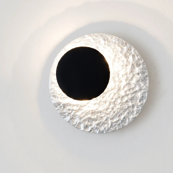 Кръгла LED лампа за стена Infinity за декоративно допълнително осветление LED лампата за стена Infinity предлага интересна игра на блясък, структура и светлина. Основният ѝ елемент е заден кръгъл диск от сребристо желязо с неправилна шарка от вдлъбнатини. Светодиодите зад предния, кафяво-черен елемент осветяват задния кръг и подчертават пулсиращото му сияние. Поради това Infinity е идеален за декорация и като допълнителен източник на светлина в дневните и холовете.