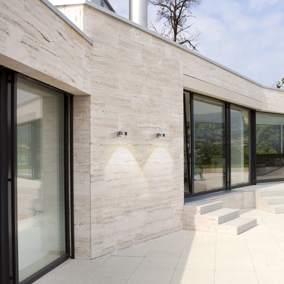 Светодиодна външна стенна лампа Puk Outdoor Wall с две лещи Светодиодната външна стенна лампа Puk Outdoor Wall впечатлява с модерния си вид и иновативен дизайн. Благодарение на двете лещи, прикрепени към корпуса, осветителното тяло излъчва топла бяла светлина както нагоре, така и надолу. По този начин се създават светлинни ефекти върху стената, които са не само чисто функционални за осветяване, но и създават приканващ ефект. Този модерен светлинен източник е икономичен по отношение на консумацията на енергия и изглежда особено добре в група от осветителни тела. Цветни филтри в различни цветови нюанси могат да бъдат поръчани като опция чрез аксесоарите. Те се поставят между корпуса и лещата.