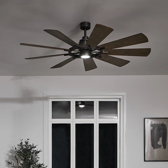 Вентилатор за таван Gentry с девет лопатки и димируемо LED осветление Вентилаторът за таван Gentry със своите внушителни размери и реверсивни лопатки в два цвята се представя като ефективен освежител на въздуха в помещения с площ до 30 m², както и като декоративен аксесоар за обзавеждане. Покритието се нарича "Weathered Zinc" и придава на външния вид леко индустриален чар. Включено е топло бяло LED осветление. В обхвата на доставката е включено дистанционно управление. Функции Вентилаторът може да се превключва на шест скорости с помощта на доставеното дистанционно управление. То може да се използва и за настройване на скоростта за движение напред или назад (лятна/зимна работа). По време на отоплителния период могат да се спестят разходи за енергия, като вентилаторът се използва за равномерно разпределяне на въздуха, загрят от източника на топлина, в цялото помещение. LED осветлението също може да се включва и изключва и да се затъмнява непрекъснато с помощта на дистанционното управление. Технически данни - Двигател за постоянен ток: 28,2 W - Скорост: мин. 124 об/мин, макс. 158 об/мин - Дебит на циркулиращия въздух: 7 648 m³