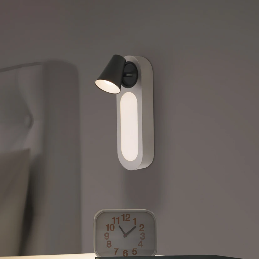 Стенна лампа Neptune LED с прожектор и източник на светлина в елемента на стената Стенната лампа Neptune LED е оборудвана с два източника на светлина - топлобели светодиоди са инсталирани в регулируемия прожектор и в елемента на стената. Двата светлинни източника могат да се включат поотделно или заедно с помощта на превключвателя отстрани на осветителното тяло. Този 3-степенен превключвател (Click Select) позволява да се избере отделно основното осветление и осветлението на главата на осветителя - Регулируем прожектор - Включени аксесоари за монтаж и свързване