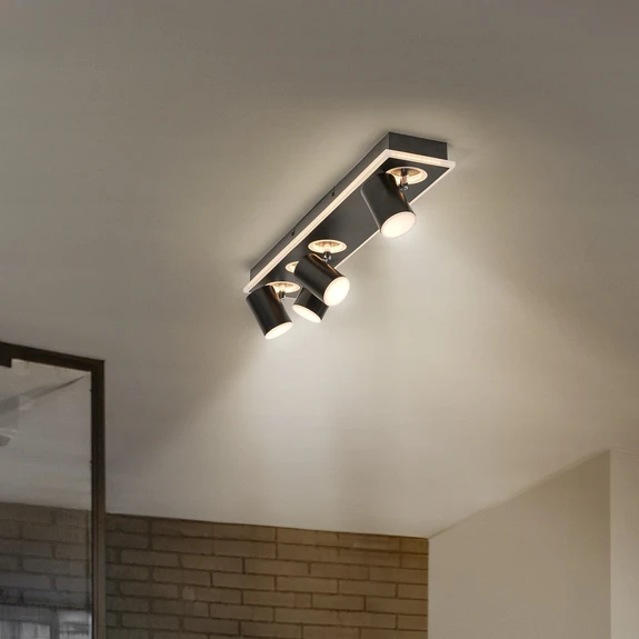 Светодиодна лампа за таван Mars с пет светлинни източника - 4 светлинни точки и околна светлина Светодиодната лампа за таван Mars е оборудвана с един светлинен източник на тавана и четири светлинни източника в светлинните точки. Светлинните източници в спотовете и околната светлина могат да се включват поотделно или заедно с помощта на 3-степенното превключване (click-select) чрез превключвателя за светлина чрез многократно превключване. Спотовете могат да се регулират, за да се изравни светлинният конус. По този начин LED лампата за таван Mars осигурява както меко фоново осветление, така и насочена светлина за подчертаване на отделни зони в помещението. Подходяща е за многобройни приложения на закрито, независимо дали във всекидневната, коридора, спалнята или кухнята, като може да се монтира и на стена - висококачествен корпус с матова повърхност - включени пълни аксесоари за монтаж и свързване