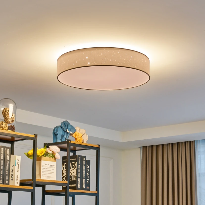 Светодиодна лампа за таван Ellamina с функция за димер и таймер, промяна на цвета CCT Светодиодната лампа за таван Ellamina впечатлява с функционалния си дизайн. Осветителното тяло има не само практична функция за нощна светлина, но яркостта и температурата на светлината му могат да се регулират и с помощта на включеното в комплекта дистанционно управление. Функцията за регулиране на яркостта е безстепенна, а температурата на светлината може да се настройва на три различни нива - от топло бяло до дневна светлина. Абажурът е изработен от текстил и действа като разсейвател, който нежно разпръсква светлината, позволявайки тя да се разпредели равномерно и без отблясъци в цялото помещение. Дизайнът е модерен и приятен отвсякъде. Повърхността на абажура е с блестящ ефект. Строго погледнато, това са изрезки в тъканта, които напомнят на звездно небе, когато LED източникът на светлина е включен.