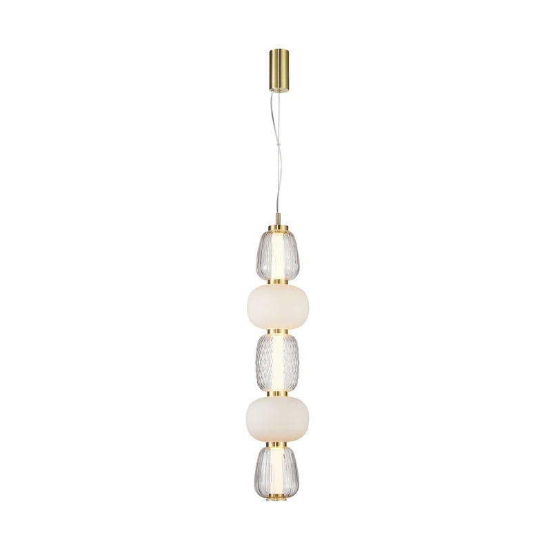 Вертикална LED висяща лампа Pearl 5 с опалово и тонирано стъкло и метални детайли LED висящата лампа Pearl 5 привлича погледите в дневните и холовете. Топлият бял LED светлинен източник е разположен в тръбен вътрешен разсейвател, който преминава през пет издухани стъклени елемента. Две опалови стъкла с овална форма са комбинирани с три тонирани стъкла с различни форми и текстури. Има и цилиндричен сенник и метални детайли.