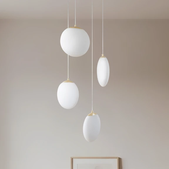 Четирипламъчна висяща лампа Lunelle в характерна цветова комбинация от бяло и месинг