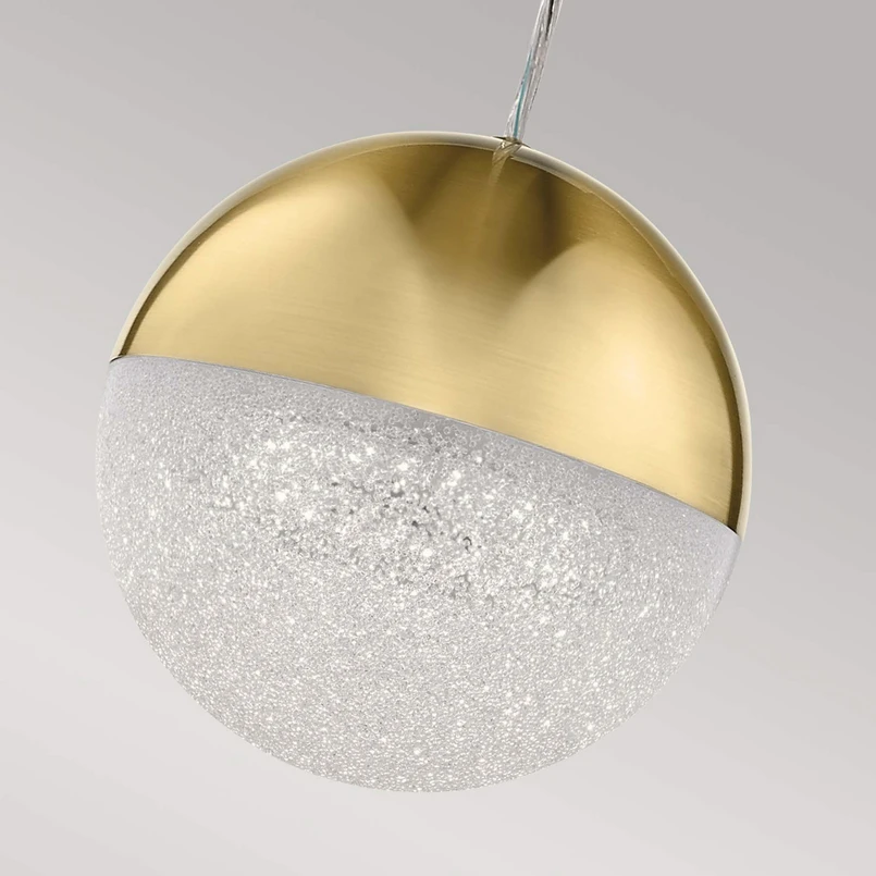 LED висяща лампа с лунна светлина Висящата лампа с лунна светлина има сферична форма, която оправдава името ѝ и придава ефект на лунна светлина във всяка стая. Нейният абажур от две части е изработен от алуминий в горната част и от акрил с чипове от циркониев оксид в долната част, които разсейват чудесно светлината и искрят в светлината. Монтиран поотделно или като двойка или тройка, висящият осветител Moonlit може да се използва за осветяване на най-различни зони - от дневната до трапезарията и кухнята. Благодарение на дългия кабел тя може да се използва и в спалнята като заместител на нощната лампа.