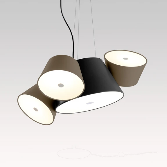 Матово покритие: Tam Tam Мини висяща лампа с централен абажур и три подвижни сателита, без отблясъци Дизайнът на модерната висяща лампа Tam Tam Mini е създаден от дизайнера Фабиен Дюма, който иска да създаде с нея усещане за организиран хаос. В центъра е разположен голям абажур, който свети твърдо надолу. От външната страна са прикрепени три по-малки абажура, които могат да се въртят и по този начин да се ориентират по желание. В големия абажур могат да се поставят две лампи Е27, а малките сателити са снабдени с по една лампа Е27 (вж. аксесоарите). Настроението на осветлението може да се повлияе чрез избиране на подходящ източник на светлина, а при необходимост абажурите могат да се оборудват с различни лампи. Всички абажури са снабдени с бял опалов разсейвател, за да се осигури хомогенно излъчване на светлина без отблясъци. Tam Tam Mini се поддържа от три кабела, които завършват с кръгъл, плосък сенник на тавана. Това естетично висящо осветително тяло е впечатляващ съвременен дизайнерски елемент в интериора, дори когато светлината е изключена. Tam Tam Mini се произвежда от испанския производител Marset, който е известен с иновативния си дизайн и високото си качество.