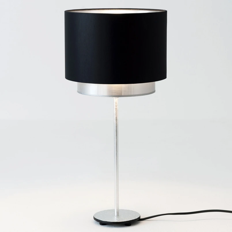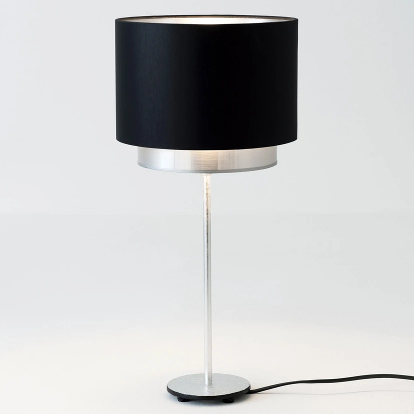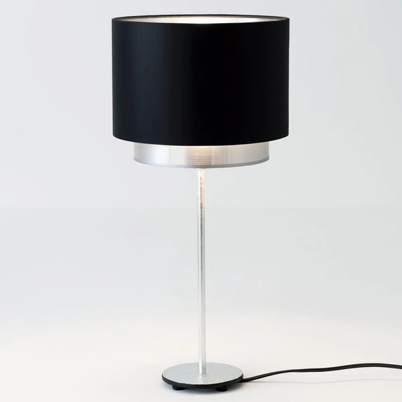 Настолна лампа Mattia с абажур от текстил в черно и сребристо Неподвластна на времето и елегантна - това е визията на настолната лампа Mattia със сребриста рамка и текстурирана основа в сребрист цвят. Дизайнът на абажура е особено атрактивен и привлича вниманието на всички. Абажурът от ситни цветове е изработен от два слоя, като горната част е черна, а долната - сребриста. Отвътре абажурът е изцяло в сребрист цвят. Аксесоар за обзавеждане, който подхожда на много интериорни стилове и гарантира уютно допълнително осветление.
