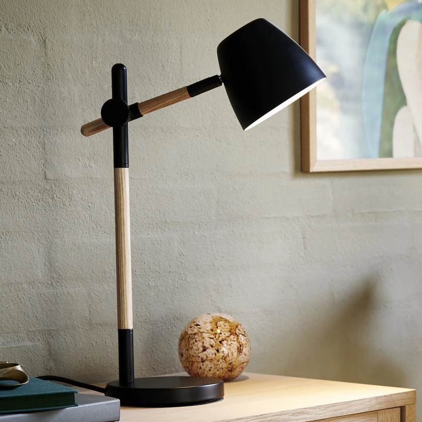 Настолна лампа Theo с елементи от ясенова дървесина Настолната лампа Theo е проектирана с успешна комбинация от светло дърво и черен метал. Абажурът може да се върти, както и да се накланя нагоре и надолу, за да насочи светлинния конус по желание. Светлинният прът е частично изработен от ясенова дървесина и се съчетава добре с други дървени мебели. В допълнение към скандинавския стил на обзавеждане, Theo се вписва чудесно и в модерна среда, а освен това има и устойчив компонент, тъй като дървесината е сертифицирана по FSC. Върху захранващия кабел има превключвател.