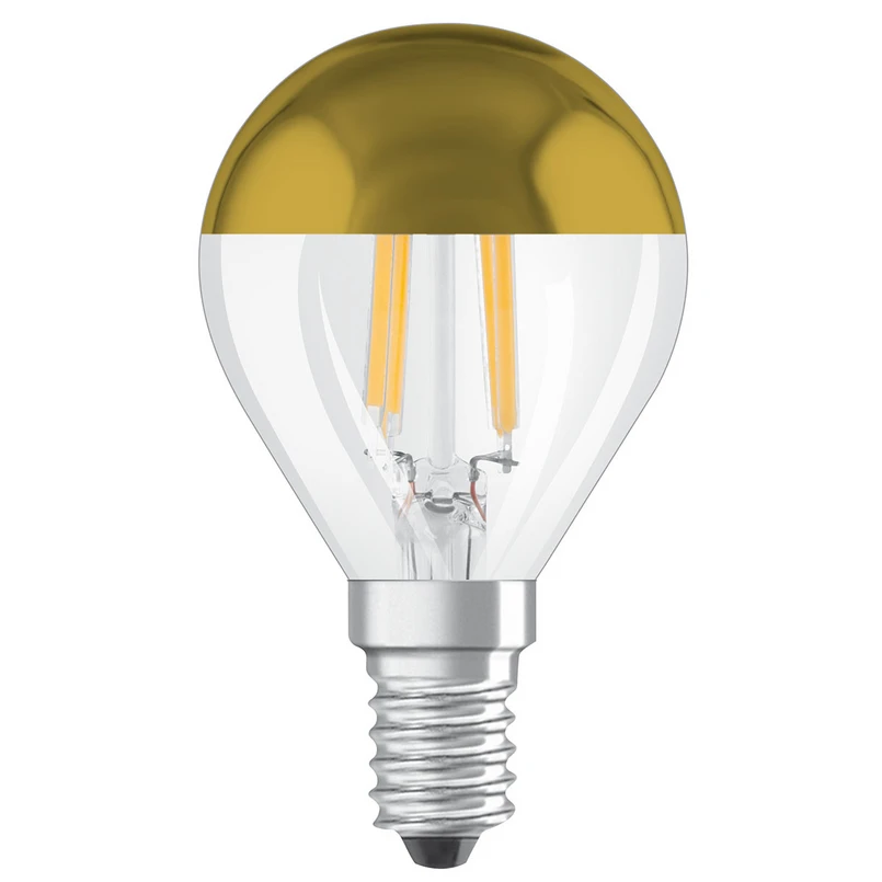 LED лампа E14 със златиста огледална глава, 4W, 2700К Златната огледална глава на този светлинен източник E14 от OSRAM осигурява красив външен вид и директен поглед към източника на светлина без отблясъци. Светодиодите, разположени по технологията с нажежаема жичка, излъчват топла бяла светлина във всички посоки през прозрачното стъкло под рефлектора. Източникът на светлина е особено подходящ за използване в огледала или открити осветителни тела с пряка видимост към лампата.