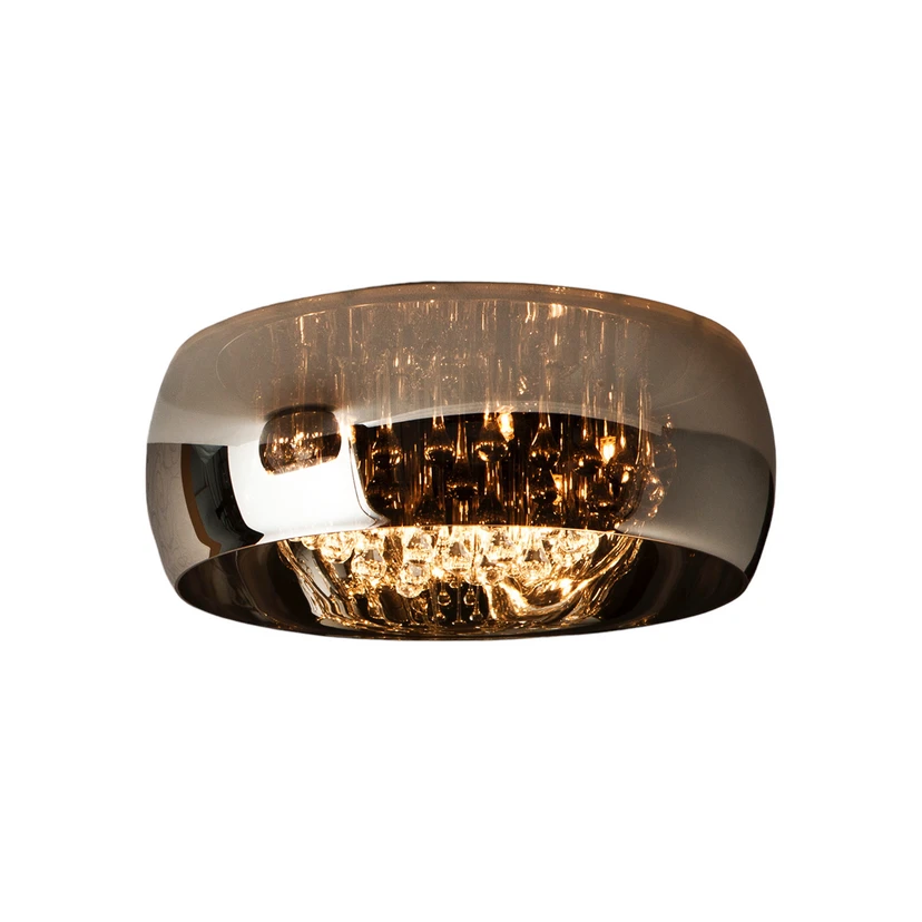 Лампа за таван Argos от стъкло с висулка в абажура Абажурът на тази елегантна, лъскава лампа за таван Argos е изработен от прозрачно кафяво стъкло с хромирано покритие и е леко прозрачен. Това означава, че искрящото окачване на многото отделни кристални стъклени капки вътре се вижда отвън. Когато светлината е включена, висящите капки блестят на светлината и създават уникална игра на светлината. Осветителното тяло за таван Argos изглежда много декоративно и елегантно във всекидневни или трапезарии, но може да се монтира много добре и в коридори като престижен осветителен обект. Осветителното тяло се доставя с LED светлинен източник (G9)
