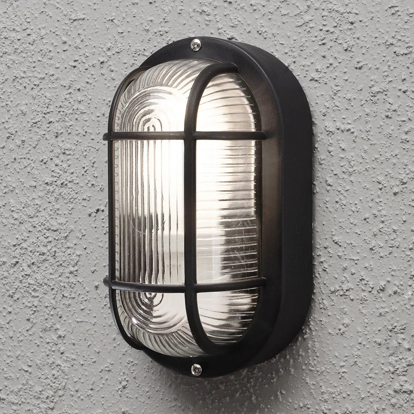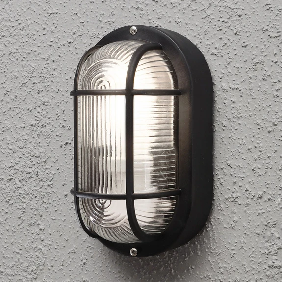Овална външна стенна лампа Elmas с декоративно стъкло Флуидното стъкло на външната стенна лампа Elmas в две различни шарки е защитено с декоративна решетка, която придава на лампата техничен вид. Стенната лампа е защитена от проникване на прах и пръски вода от всички страни със степен на защита IP44. Следователно това морско осветително тяло може да се използва на открито, но също така и във влажни мазета, например.