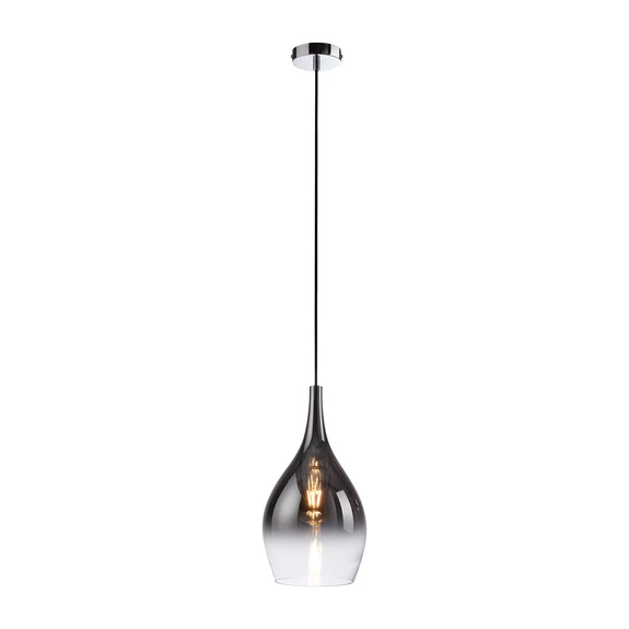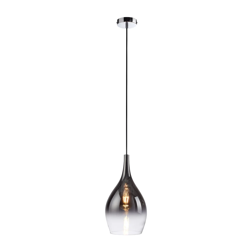 Висяща лампа Pilua с абажур от опушено стъкло Тази красива висяща лампа, наречена Pilua, е особено подходяща за монтаж над кухненски острови и маси за хранене. Тя се съчетава идеално с модерните стилове на обзавеждане. Кръглият балдахин на висящата лампа е оцветен в изискан хромиран абажур. Абажурът с форма на капка е с цветен градиент от опушено сиво до бяло, което го превръща в акцент във вашия дом. Лампата е снабдена с крушка E27.