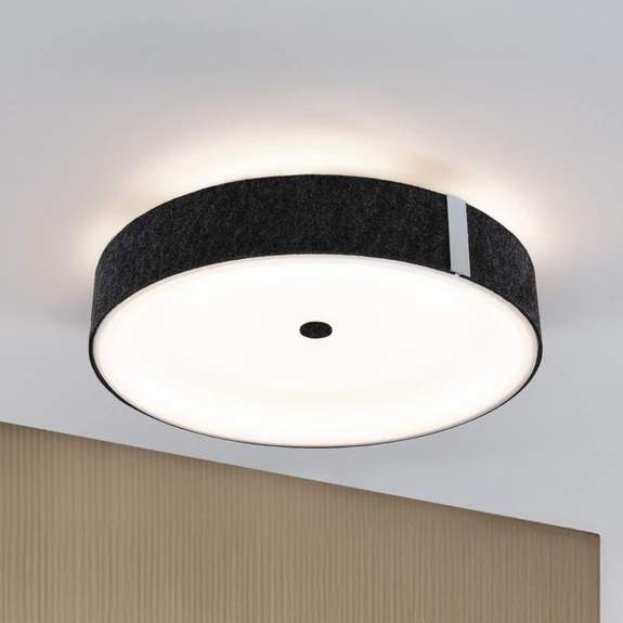 Умната LED таванна лампа Malika от филц в антрацит впечатлява не само с модерния си и изчистен дизайн, но и създава приятна атмосфера и намалява смущаващите фонови шумове. Освен директното, широко осветяване чрез матовия дифузор от долната страна, Malika осигурява и индиректна светлина през тавана. Благодарение на функцията Tunable White, цветът на светлината може да се регулира според нуждите: от дневна бяла светлина за работа до топла бяла светлина за релаксация. Лампата е съвместима с ZigBee 3.0.