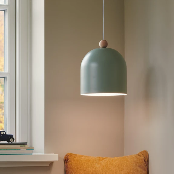 Висяща лампа Gaston с метален абажур и малък дървен детайл Gaston е висяща лампа с красиво оформен метален абажур. Малката дървена топка над абажура е декоративен детайл. Висящата лампа е идеална за използване в детски стаи, не на последно място заради красивия си цвят, но може да се използва и във всекидневни, кухни или спални. Абажурът съдържа гнездо Е27 за поставяне на светлинен източник по ваш избор.