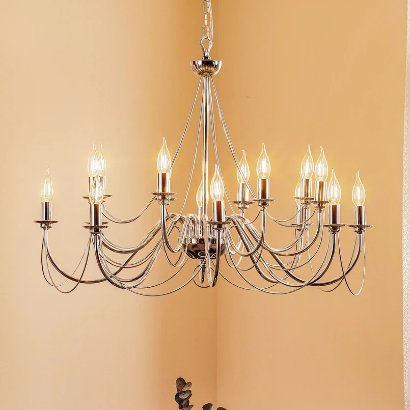 Полилей Retro, 16-пламенен, впечатлява с впечатляващата си конструкция от висококачествена стомана и елегантна хромирана повърхност. Този дизайнерски елемент се вписва безпроблемно в хола и трапезарията и придава на всяко помещение специален характер. 16-те пламъка осигуряват равномерно и впечатляващо осветление, което е подходящо както за уютни вечери, така и за празнични поводи.