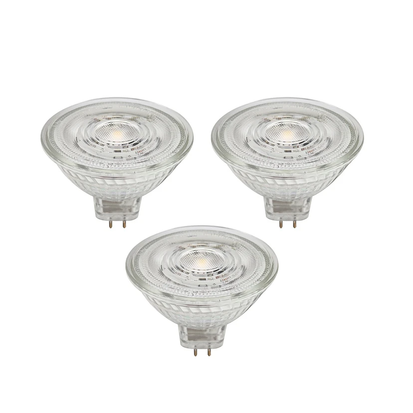 Светодиоден рефлектор GU5.3, изработен от стъкло, прозрачен, в практичен комплект от 3 броя Този светодиоден рефлектор е подходящ за множество осветителни тела с цокъл GU5.3. Той е изработен от стъкло и може да се използва гъвкаво благодарение на прозрачния си цветен дизайн - не може да се димира - 4,3 W - 345 лумена - ъгъл на излъчване 36° - доставя се в комплект от 3