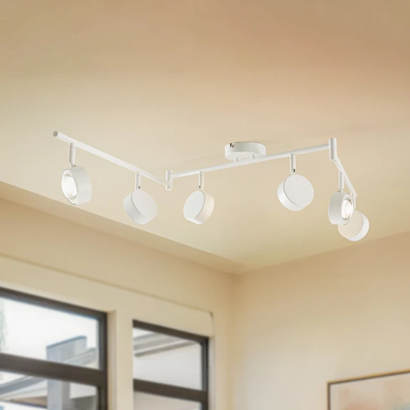 Димируем прожектор Jyla с шест регулируеми абажура Шестсветлинният прожектор за таван Jyla е изработен от желязо, а бялата му външна част придава на обстановката елегантен вид. В същото време той се вписва без усилие в различни жилищни помещения благодарение на дискретния си дизайн. Например, той е идеален за използване като източник на светлина в коридора, кухнята, дневната или трапезарията. Рамката може да се регулира на три места, а кръглите абажури могат също така гъвкаво да се накланят и завъртат. Това позволява персонализиране на светлината и оптимално осветяване на помещението. Доставените светлинни източници GX53 са с извита леща и затова изглеждат като стъклени полусфери. Светлината може да се включва и изключва както обикновено с помощта на стенен ключ. Благодарение на технологията за 3-степенно димиране с интегрирана функция за изключване, тя може да се регулира до три различни нива на яркост чрез неколкократно натискане на превключвателя: 100 %, 50 % и 25 %.