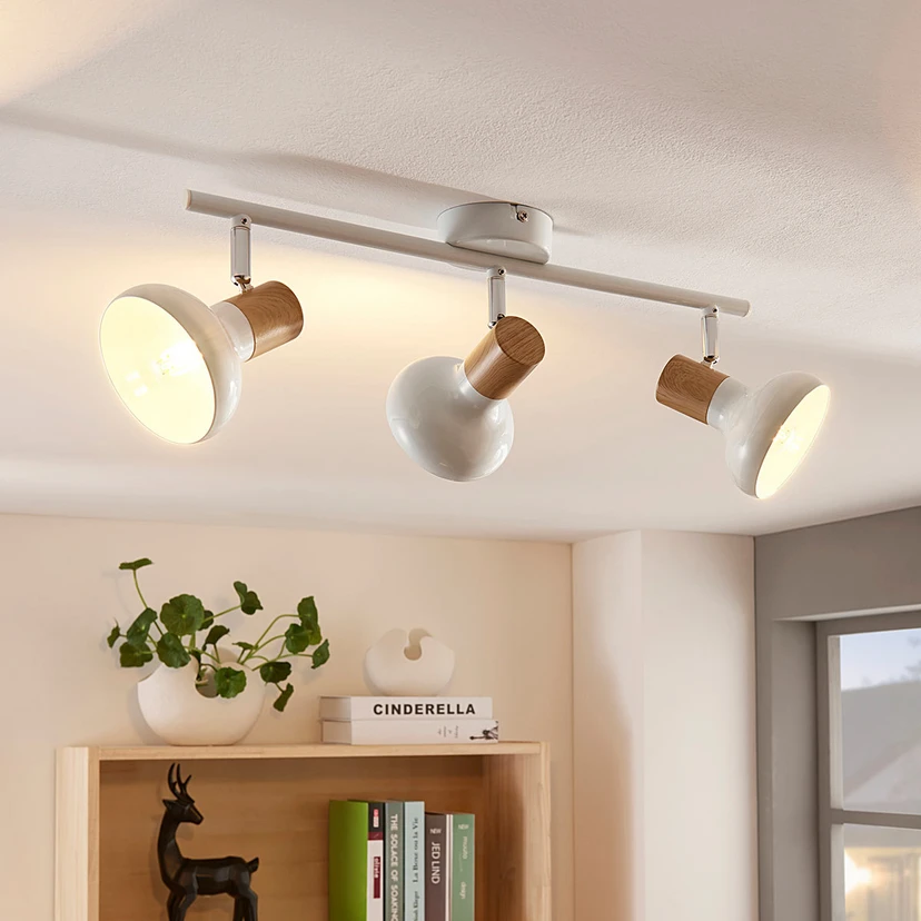 Универсална лампа за таван Fridolin от метал с три бели абажура и дървесен декор Fridolin може да произвежда достатъчно светлина за общо осветление във версията с три лампи, а абажурите могат да се въртят и завъртат за по-добро насочване на светлината. Лакираният в дървесен цвят елемент в горната част на абажурите е специална визуална характеристика. Останалите абажури са бели и като цяло лампата за таван има приятелски вид, което не на последно място се дължи на светлата цветова гама.