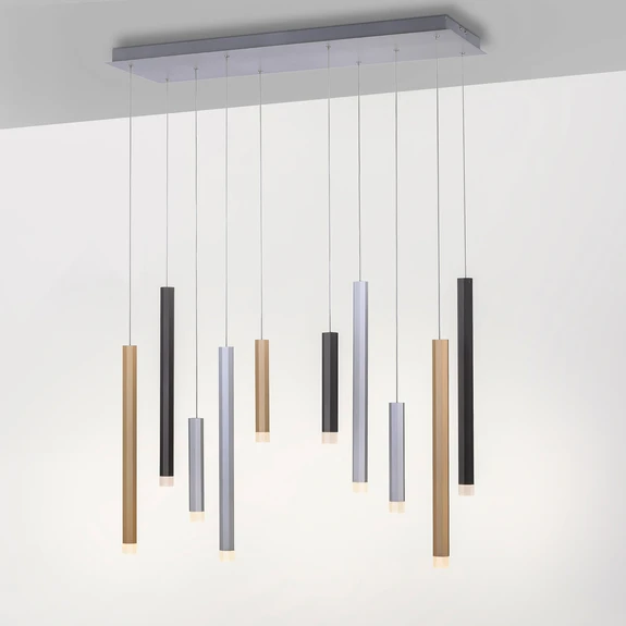 Десетпламенна LED висяща лампа Pure-Gemin - с възможност за димиране чрез превключвател Десет цилиндрични, тесни светлини с различна дължина и цвят се спускат от дългия сенник и превръщат LED висящата лампа Gemin в специален източник на светлина над дълга маса. Всеки от абажурите съдържа топлобял светодиоден модул зад разсейвателя от сатинирана пластмаса. Благодарение на функцията Simply dim (просто затъмняване) висящото осветление може да се затъмнява от пълна яркост до ниво на яркост 10 %, като се използва съществуващият стенен ключ, без да е необходимо да се монтира допълнителен димер. Избраното ниво на яркост се запаметява благодарение на функцията за запаметяване, така че осветителното тяло да светне отново с това ниво на яркост, когато бъде включено отново. Изчистеният, пуристичен дизайн на осветителните тела от серията Pure е едновременно естетичен и изискан. Той може да бъде интегриран в много интериори.