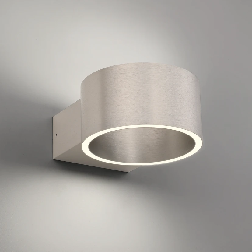 Модерна LED лампа за стена Clipse с цилиндрична форма - разпределение отгоре и отдолу, с възможност за външно димиране LED лампата за стена Clipse, изработена от алуминий, има цилиндрично тяло, чиито горна и долна част са снабдени с тесен LED пръстен. Яркостта на топлата бяла светлина може да се регулира външно според нуждите с помощта на димер Tronic.