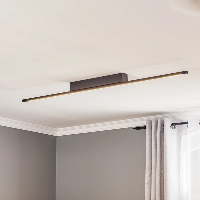 Черна, издължена LED лампа за таван Tolu в черно, димируема, произведена в Германия Tolu е атрактивна лампа за таван за изчистени жилищни пространства с модерно излъчване, тъй като осветителното тяло е изработено в минималистичен тънък дизайн, а издълженият светлинен прът, който има функцията на осветително тяло с непрекъсната LED лента от долната страна, е с особено тесни размери.