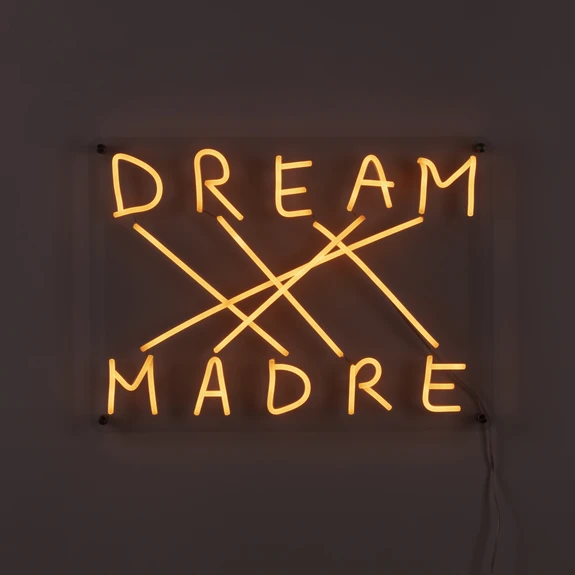 Декоративна LED светлина за стена с анаграма "Dream-Madre", жълти LED ленти Кой понякога не мечтае за любимата си майка? Това е визуализирано от тази LED стенна лампа с анаграма "Dream-Madre", която е представена от жълти силиконови LED тръби. Последните се държат на място от прозрачна, правоъгълна акрилна плоча. Тази декоративна стенна лампа умело съчетава очарованието на попарта и неоновото осветление със съвременната LED технология - Снабдена с кабел за включване и ключ за димиране - Дизайн от Nico Vascellari, Codalunga & Seletti