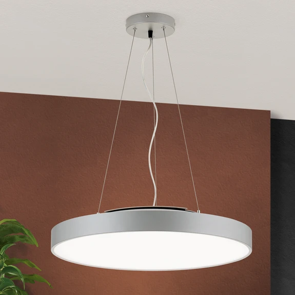 LED осветителното тяло Space е универсално Моделът Space може да се монтира както като висящо осветително тяло, така и като таванно осветително тяло. Окачването не е задължително и е включено в комплекта на кръглото осветително тяло. Микропризматичният пластмасов разсейвател разпределя равномерно светлината от вградените светодиоди в помещението - Външно затъмняване чрез изключване на фазата - Добър контрол на заслепяването: UGR < 19