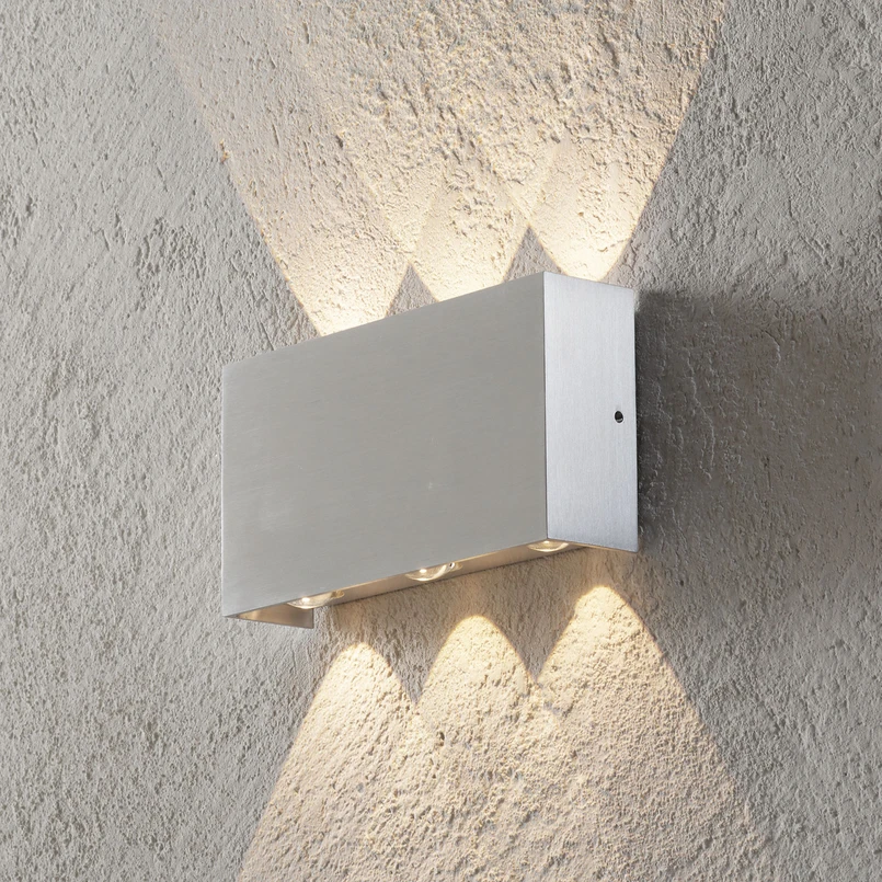Създава вълшебна светлинна атмосфера - Stream LED стенна лампа със степен на защита IP54 Stream LED стенната лампа, която може да се използва както на закрито, така и на открито благодарение на степента си на защита IP54, впечатлява със завладяваща игра на светлината. Тя е изработена от метал с вид на матиран алуминий и изглежда доста дискретно и незабележимо на стената, когато е изключена. Когато обаче се добави светлина, тя се превръща в незабравим акцент, тъй като трите изпъкнали стъклени лещи в горната и долната част на рамката създават спиращи дъха конуси от светлина върху стената, които имат положителен ефект не само върху външния вид, но и върху светлинното настроение.